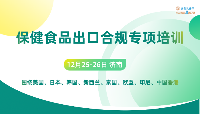 为助力企业突破出口面临的合规壁垒,食品伙伴网将举办 “2025保健食品出口合规专项培训”。本次培训聚焦美国、新西兰、印尼、日韩等关键市场的具体准入流程,解决从原料认证、功能宣称到标签备案的实际痛点,最终帮助企业将合规要求转化为可落地的竞争能力,确保产品高效、安全地进入国际市场,同时为食品出口人提供一个学习和交流的平台!